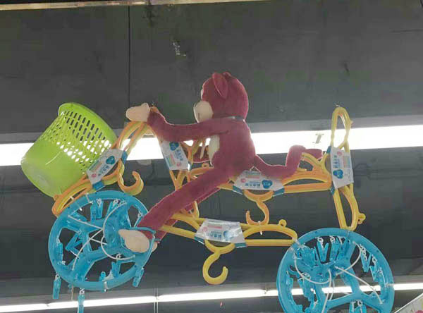 在這家超市的日用品售賣區,“猴兒騎自行車”掛在頂棚處,兩個衣架為車輪,若干個衣掛組成扶手、橫梁、車座,垃圾桶則恰到好處地在車前成為車筐。整個造型創意十足、形象逼真、顏色鮮艷、熱鬧有趣,很多逛超市的市民看到了都感嘆“太有才啦!”。